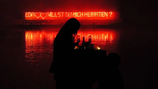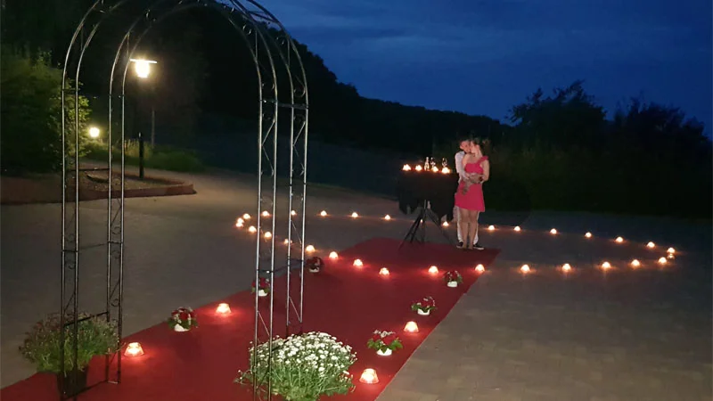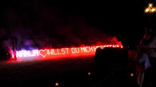 - Maßgeschneiderte Dekoration: Vom 8 m großen Lichterbild mit Ihrem Namen und Symbolen der Liebe bis hin zu einem 25 m langen Kerzen-Lichtergang, Rosenbögen und Bodenherzen.
